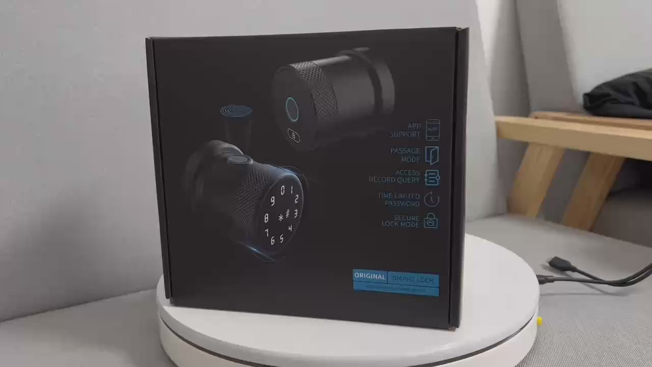 The package includes two cylindrical lock units (interior and exterior), two IC cards, two mechanical keys, a latch mechanism with installation hardware, and a USB charging cable. With its compact, minimalist design and advanced functionality, this smart lock is an excellent choice for modern homes, apartments, and offices that prioritize both aesthetics and smart security.